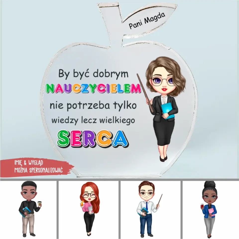 Poszukujesz idealnego prezentu dla nauczyciela, który zadziwi i ucieszy? Nasza kolekcja oferuje unikalne, spersonalizowane prezenty, które wyrażają wdzięczność i szacunek w niezwykły sposób. Wybierz z naszej szerokiej gamy produktów, które można dostosować do zainteresowań i preferencji nauczyciela. Nasze spersonalizowane prezenty są doskonałym sposobem na wyrażenie wdzięczności za ich poświęcenie i oddanie w pracy edukacyjnej. Znajdź inspirujący prezent już dziś! Prezent dla nauczyciela, współpracowników, dziewczyny, chłopaka, siostry i przyjaciółki na dzień nauczyciela. Spersonalizowany presenty ok córki, syna, dzieci, koleżanki, męża, matki, przyjaciół. Wybierz postacie, fryzury, kolor włosów i ubrania i stwórz swój własny, niepowtarzalny projekt prezentu.